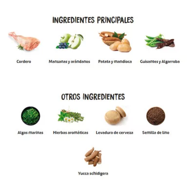 Carne fresca de cordero* (min. 40% antes de la extrusión), carne deshidratada (21%), guisantes enteros*, grasa animal (preservada con antioxidantes naturales), raíces de mandioca*, pescados deshidratados 5% (anchoveta, jurel y caballa), patata deshidratada*, levadura de cerveza*, vaina de algarroba*, pulpa de remolacha, semilla de lino*, huevo deshidratado*, manzana fresca* (1%), alfalfa deshidratada*, aceite de pescado (preservado con antioxidantes naturales), sal gema*, fructo y manano oligosacáridos, algas marinas deshidratadas*, glucosamina, condroitina, yucca schidigera, arándanos*, tomillo*, flor de manzanilla*, hinojo*, equinácea*, té verde*. *Ingredientes naturales.