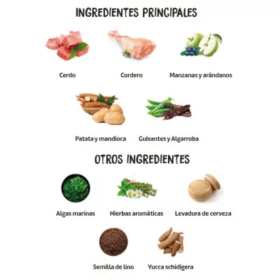 carnes (mín. 10% cordero fresco antes de la extrusión), guisantes, grasa animal, tapioca, garrofa, pulpa de remolacha, levadura de cerveza, manzana, cítricos, semilla de lino, alfalfa, aceite de pescado, cloruro sódico, fructooligosacáridos y mananooligosacáridos (FOS y MOS), condroitina y glucosamina, lecitinas, extractos vegetales de cítricos y romero, plantas (flor de manzanilla y tomillo), Yuca schidigera.