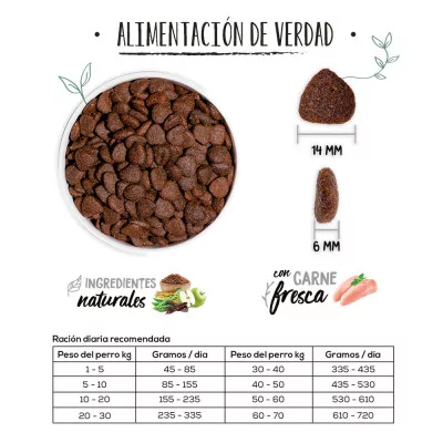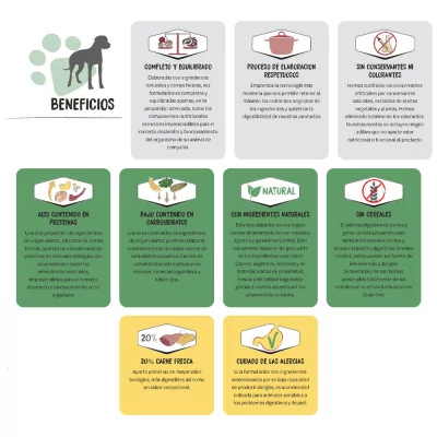 Rico en proteínas animales que aportan a la nutrición del perro un alto valor biológico y todos los aminoácidos que su cuerpo necesita.