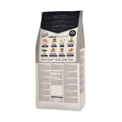 Carnes 35% (carnes deshidratadas 25%, pollo fresco* 10% antes de la extrusión), trigo integral* (21%), maíz integral* (10%), cebada integral* (9%), arroz integral* (7% ), salvado de trigo* (6%), algarroba* (2%), guisantes enteros* (2%), grasa de pollo, manzana* (1%), aceite de salmón, linaza* (1%), pulpa de remolacha, hidrolizado de pollo. proteínas, fructo y mananooligosacáridos, levadura de cerveza* (0,5%), hierbas aromáticas 0,02% (hinojo*, equinácea*, tomillo*), yuca schidigera. *INGREDIENTES NATURALES