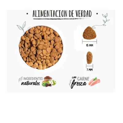 Carnes 35% (carnes deshidratadas 25%, pollo fresco* 10% antes de la extrusión), trigo integral* (21%), maíz integral* (10%), cebada integral* (9%), arroz integral* (7% ), salvado de trigo* (6%), algarroba* (2%), guisantes enteros* (2%), grasa de pollo, manzana* (1%), aceite de salmón, linaza* (1%), pulpa de remolacha, hidrolizado de pollo. proteínas, fructo y mananooligosacáridos, levadura de cerveza* (0,5%), hierbas aromáticas 0,02% (hinojo*, equinácea*, tomillo*), yuca schidigera. *INGREDIENTES NATURALES