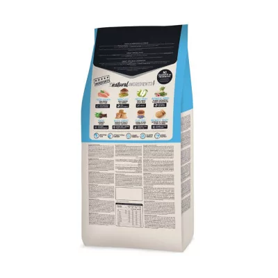 Carnes 39% (carnes deshidratadas 29%, pollo fresco* 10% antes de la extrusión), arroz integral* (12%), trigo integral* (9%), grasa de pollo, maíz integral* (8%), salvado de trigo* (8%), cebada entera* (7%), guisantes enteros* (2%), manzana* (1%), aceite de salmón, linaza* (1%), pulpa de remolacha, fructo y mananooligosacáridos, levadura de cerveza. * (0,5%), hierbas aromáticas 0,02% (hinojo*, equinácea*, tomillo*), yuca schidigera. *INGREDIENTES NATURALES