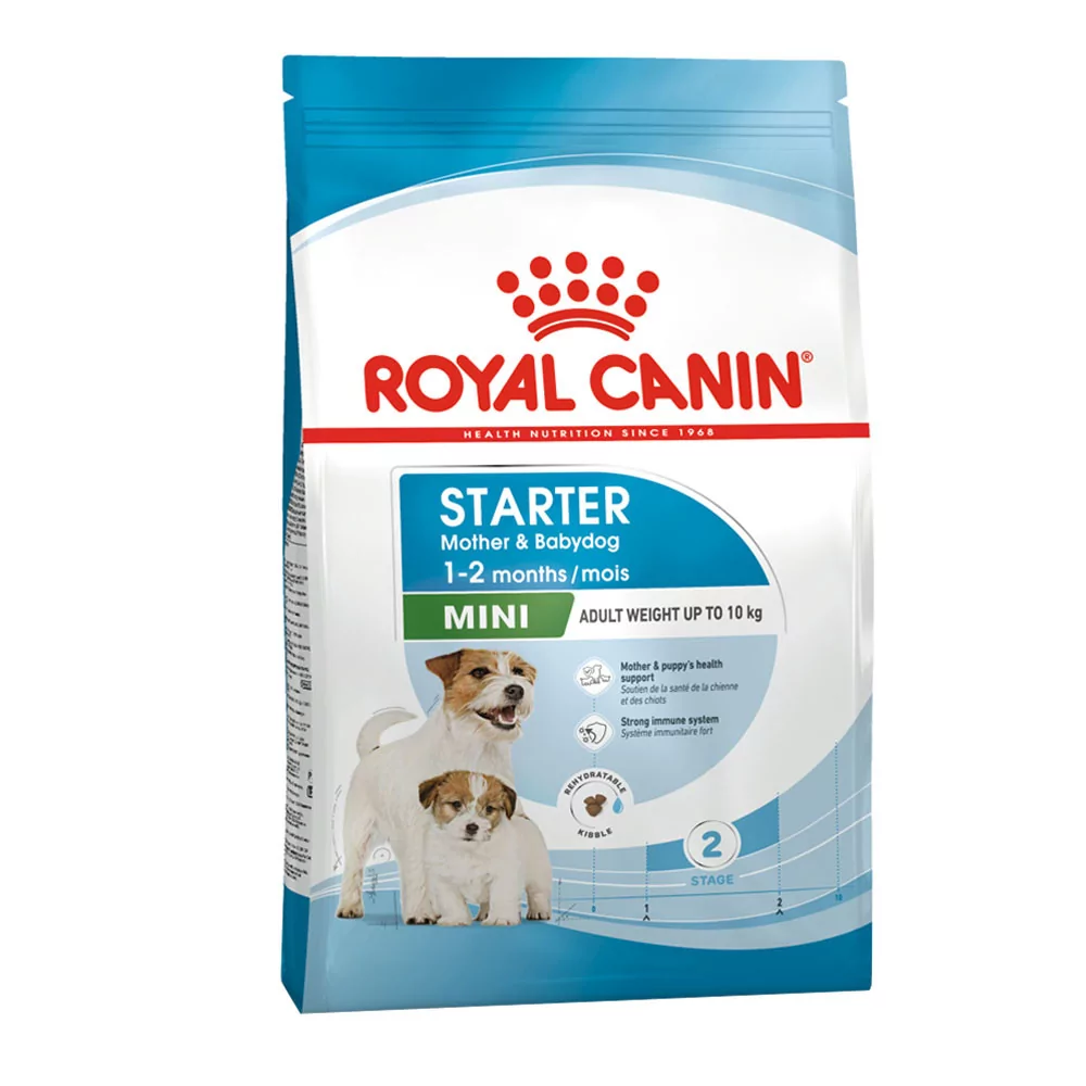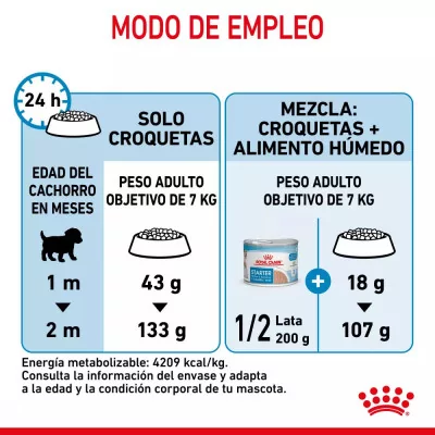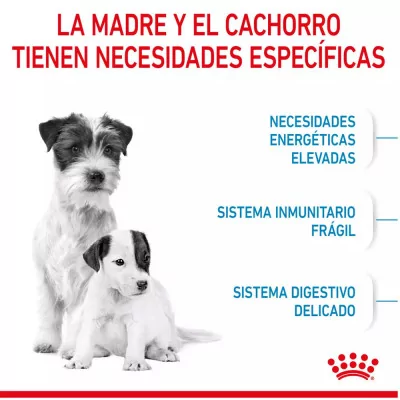 ROYAL CANIN® Mini Starter Mother & Babydog está especialmente formulado para satisfacer las necesidades nutricionales tanto de las perras pequeñas después del parto como de sus cachorros durante el periodo de destete, que abarca hasta los 2 meses de edad. Esta fórmula es adecuada para perras adultas de razas pequeñas, con un peso máximo de 10 kg, y sus cachorros, proporcionando el soporte nutricional esencial durante una etapa crítica de su desarrollo.