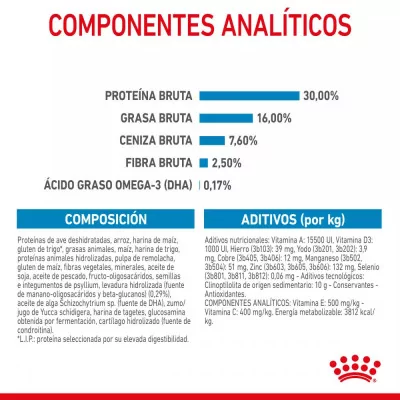 Composición: Proteína de ave deshidratada, grasas animales, maíz, gluten de trigo, pulpa de remolacha, harina de trigo, gluten de maíz, proteínas animales hidrolizadas, harina de maíz, arroz, trigo, minerales, aceite de soja, productos de levaduras, aceite de pescado, fructo-oligosacáridos, levadura hidrolizada (fuente de manano-oligosacáridos y beta-glucanos) (0,29%), aceite de alga Schizochytrium sp. (fuente de DHA), zumo/jugo de Yucca schidigera, harina de tagetes.