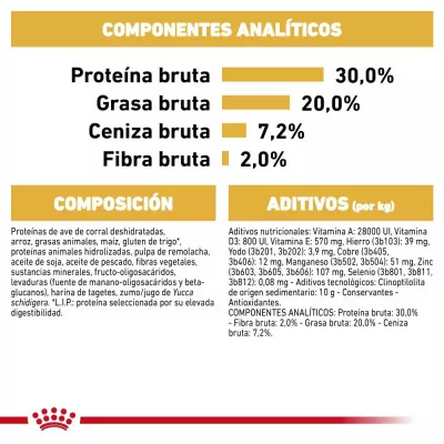 Composición: Proteínas de ave de corral deshidratadas, arroz, grasas animales, maíz, gluten de trigo*, proteínas animales hidrolizadas, pulpa de remolacha, aceite de soja, aceite de pescado, fibras vegetales, sustancias minerales, fructo-oligosacáridos, levaduras (fuente de manano-oligosacáridos y beta-glucanos), harina de tagetes, zumo/jugo de Yucca schidigera.