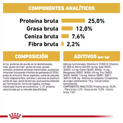 Composición: Arroz, proteínas de ave de corral deshidratadas, maíz, gluten de trigo, gluten de maíz, grasas animales, proteínas animales hidrolizadas, sustancias minerales (incluyendo trifosfato de pentasodio), pulpa de achicoria, fibras vegetales, aceite de pescado, fructo-oligosacáridos, semillas y cáscaras de psyllium, aceite de soja, aceite de borraja, glucosamina obtenida por fermentación, harina de tagetes, cartílago hidrolizado (fuente de condroitina).