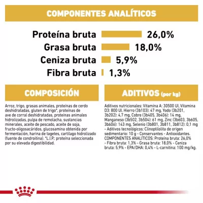 Composición: Arroz, trigo, grasas animales, proteínas de cerdo deshidratadas, gluten de trigo, proteínas de ave de corral deshidratadas, proteínas animales hidrolizadas, pulpa de remolacha, sustancias minerales, aceite de pescado, aceite de soja, fructo-oligosacáridos, glucosamina obtenida por fermentación, harina de tagetes, cartílago hidrolizado.