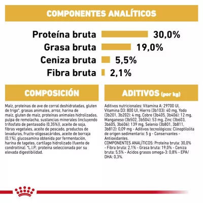 Composición: maíz, proteínas de ave de corral deshidratadas, gluten de trigo*, grasas animales, arroz, harina de maíz, gluten de maíz, proteínas animales hidrolizadas, pulpa de remolacha, sustancias minerales (incluyendo trifosfato de pentasodio (0,35%)), aceite de soja, fibras vegetales, aceite de pescado, productos de levaduras, fructo-oligosacáridos, aceite de borraja (0,1%), glucosamina obtenida por fermentación, harina de tagetes, cartílago hidrolizado (fuente de condroitina).