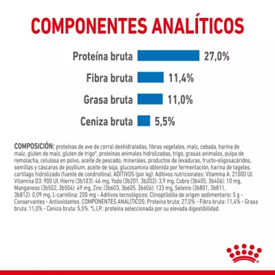 Composición: proteínas de ave de corral deshidratadas, fibras vegetales, maíz, cebada, harina de maíz, gluten de maíz, gluten de trigo*, proteínas animales hidrolizadas, trigo, grasas animales, pulpa de remolacha, celulosa en polvo, aceite de pescado, sustancias minerales, productos de levaduras, fructo-oligosacáridos, semillas y cáscaras de psyllium, aceite de soja, glucosamina obtenida por fermentación, harina de tagetes, cartílago hidrolizado (fuente de condroitina).