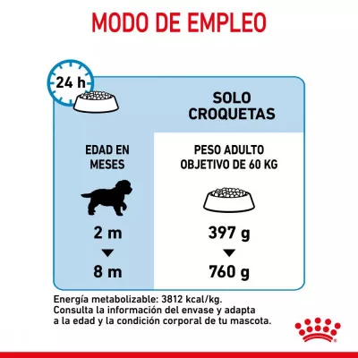 Al alcanzar los 8 meses de edad, es recomendable cambiar a Royal Canin Giant Junior, una fórmula diseñada para continuar apoyando el desarrollo de tu perro en su siguiente etapa de crecimiento.