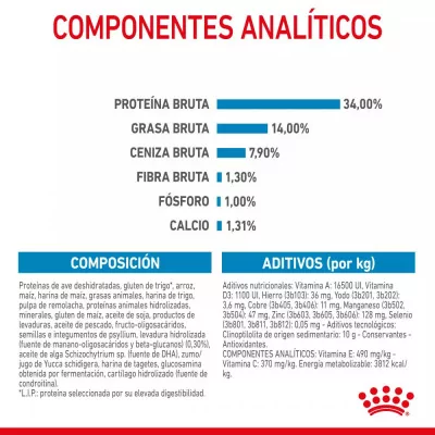 Composición: proteína de ave de corral deshidratada, gluten de trigo*, arroz, maíz, harina de maíz, grasas animales, harina de trigo, pulpa de remolacha, proteínas animales hidrolizadas, minerales, gluten de maíz, aceite de soja, productos de levaduras, aceite de pescado, fructo-oligosacáridos, semillas e integumentos de psyllium, levadura hidrolizada (fuente de manano-oligosacáridos y beta-glucanos) (0,30%), aceite de alga Schizochytrium sp. (fuente de DHA), zumo/jugo de Yucca schidigera, harina de tagetes, glucosamina obtenida por fermentación, cartílago hidrolizado (fuente de condroitina).
