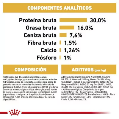 Composición: Proteína de ave deshidratada, arroz, maíz, gluten de trigo*, grasa animal, hidrolizado de proteínas animales, pulpa de remolacha, aceite de soja, aceite de pescado, minerales (incl. trifosfato pentasódico; 0,35%), levaduras (fuente de manano-oligosacáridos y beta-glucanos). trifosfato pentasódico; 0,35%), fructooligosacáridos (0,5%), levaduras (fuente de mananooligosacáridos y betaglucanos), harina de caléndula, glucosamina de fermentación, zumo de yuca schidigera, hidrolizado de cartílago (fuente de condroitina).
