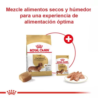 Para mayor versatilidad, este alimento también está disponible en formato húmedo Paté Royal Canin Dachshund Adulto, ideal para combinar con las croquetas y ofrecer una experiencia alimenticia mixta y equilibrada.