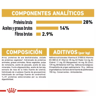 Composición: arroz, proteínas de ave de corral deshidratadas, gluten de trigo*, proteínas animales hidrolizadas, grasas animales, fibras vegetales, pulpa de remolacha, sustancias minerales (incluyendo trifosfato de pentasodio (0,35%)), aceite de pescado, aceite de soja, fructo-oligosacáridos, aceite de borraja, harina de tagetes, glucosamina obtenida por fermentación, cartílago hidrolizado (fuente de condroitina)