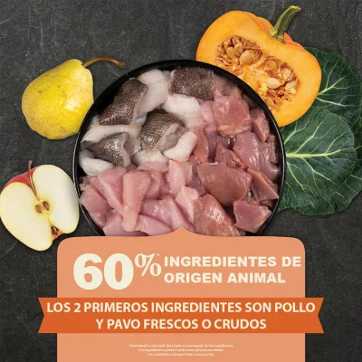 Ingredientes: Pollo, pavo, harina de pollo, guisantes verdes enteros, lentejas rojas enteras, grasa de pollo, harina de pavo, lenguado, huevos, aceite de pescado, guisantes amarillos enteros, fibra de lentejas, caldo de pollo, garbanzos enteros, lentejas verdes enteras, frijoles pintos enteros, almidón de guisante, sabor natural a pollo, hígado de pollo, corazón de pollo, sal, suplemento de vitamina E, algas secas, proteinato de zinc, tocoferoles mixtos (conservante), calabaza entera, col rizada, manzanas enteras, peras enteras, pantotenato de calcio, mononitrato de tiamina, pollo liofilizado, pavo liofilizado, riboflavina, ácido fólico, proteinato de cobre, raíz de achicoria seca, cúrcuma, raíz de zarzaparrilla, raíz de althea, escaramujos, bayas de enebro, ácido cítrico (conservante), extracto de romero, producto de fermentación de Lactobacillus acidophilus seco, producto de fermentación de Bifidobacterium animalis seco, producto de fermentación de Lactobacillus casei seco.