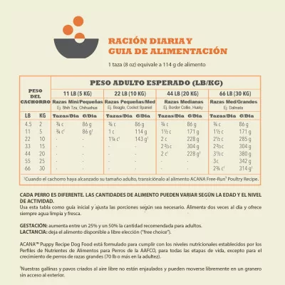 El alimento para perros ACANA PUPPY RECIPE está formulado para cumplir con los niveles nutricionales establecidos por los perfiles de nutrientes de alimentos para perros de la AAFCO para todas las etapas de la vida, incluido el crecimiento de perros de gran tamaño (70 lb o más en la edad adulta).
