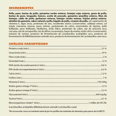 Análisis garantizado: Proteína cruda (mín.) 31 %, Grasa bruta (mín.) 19 %, Fibra cruda (máx.) 5 %, Humedad (máx.) 12 %, DHA (ácido docosahexaenoico) (mín.) 0,4 %, EPA (ácido eicosapentaenoico) (mín.) 0,2 %, Calcio (mín.) 1,2 %, Fósforo (mín.) 1 %, Vitamina E (mín.) 750 UI/kg, Ácidos grasos omega-3*(mín.) 1,3 %, Ácidos grasos omega-6*(mín.) 2,3 %, Glucosamina*(mín.) 600 mg/kg, Taurina*(mín.) 0,1 %, Microorganismos totales* (mín.) 1 millón de UFC/lb.