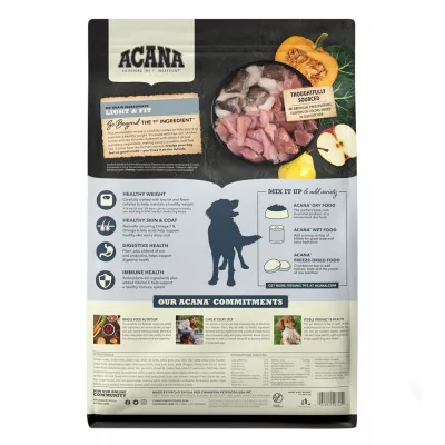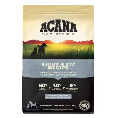 ACANA Light & Fit Recipe está diseñado para perros adultos que necesitan mantener un peso saludable sin sacrificar sabor ni nutrición. Combina 60% de ingredientes animales de alta calidad (pollo y pavo frescos/crudos como primeros componentes), y está equilibrado con 40 % de una variedad de frutas y verduras ricas en fibra (calabaza, manzanas, peras).