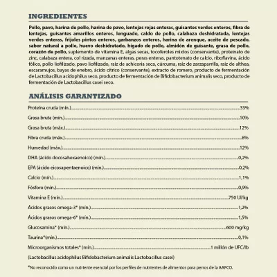 Análisis garantizado: Proteína cruda (mín.) 33%, Grasa bruta (mín.) 10%, Grasa bruta (máx.) 12%, Fibra cruda (máx.) 8%, Humedad (máx.) 12%, DHA (ácido docosahexaenoico) (mín.) 0,2%, EPA (ácido eicosapentaenoico) (mín.) 0,2%, Calcio (mín.) 1,1%, Fósforo (mín.) 0,9%, Vitamina E (mín.) 750 UI/kg, Ácidos grasos omega-3* (mín.) 1,2%, Ácidos grasos omega-6* (mín.) 1,5%, Glucosamina* (mín.) 600 mg/kg, Taurina*(mín.) 0,1%, Microorganismos totales* (mín.) 1 millón de UFC/lb.