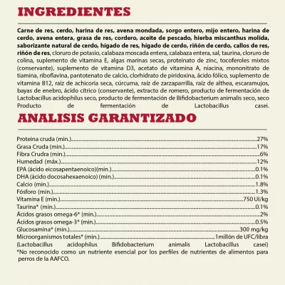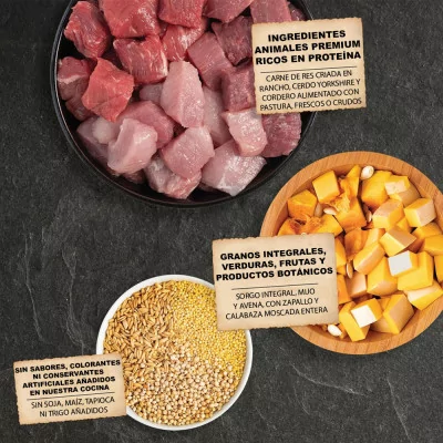 Ingredientes: Carne de res, cerdo, harina de res, avena mondada, sorgo entero, mijo entero, harina de cerdo, avena entera, grasa de res, cordero, aceite de pescado, hierba miscanthus molida, saborizante natural de cerdo, hígado de res, hígado de cerdo, riñón de cerdo, callos de res, riñón de res, cloruro de potasio, calabaza moscada entera, calabaza entera, sal, taurina, cloruro de colina, suplemento de vitamina E, algas marinas secas, proteinato de zinc, tocoferoles mixtos (conservante), suplemento de vitamina D3, acetato de vitamina A, niacina, mononitrato de tiamina, riboflavina, pantotenato de calcio, clorhidrato de piridoxina, ácido fólico, suplemento de vitamina B12, raíz de achicoria seca, cúrcuma, raíz de zarzaparrilla, raíz de althea, escaramujos, bayas de enebro, ácido cítrico (conservante), extracto de romero, producto de fermentación de Lactobacillus acidophilus seco, producto de fermentación de Bifidobacterium animalis seco, seco Producto de fermentación de Lactobacillus casei.