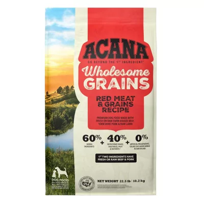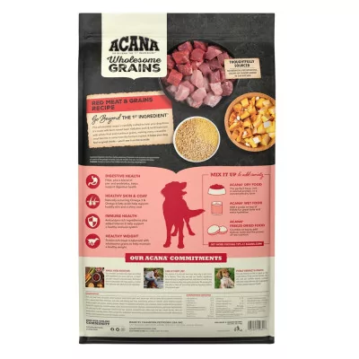 ACANA RED MEAT RECIPE WITH WHOLESOME GRAINS está formulada para cumplir con los niveles nutricionales establecidos por los perfiles de nutrientes de alimentos para perros de la AAFCO para todas las etapas de la vida, excepto para el crecimiento de perros de razas grandes (70 libras o más en la edad adulta).
