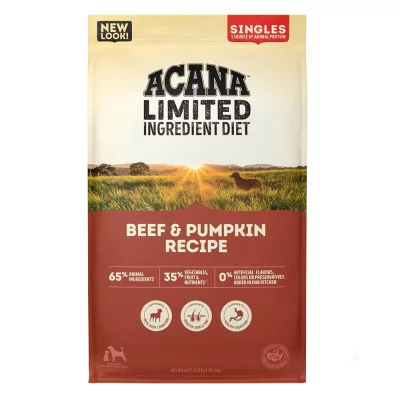 Singles, Beef & Pumpkin Recipe ACANA está especialmente formulada para perros con digestiones sensibles o que requieren una alimentación más sencilla y equilibrada. Con un 65 % de ingredientes animales provenientes de carne e hígado de res crudos, esta receta ofrece proteínas de alta calidad y gran sabor para mantener la masa muscular magra y la energía diaria.