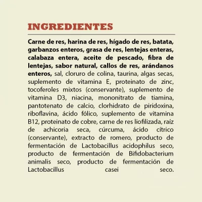 Ingredientes: Carne de res, harina de res, hígado de res, batata, garbanzos enteros, grasa de res, lentejas enteras, calabaza entera, aceite de pescado, fibra de lentejas, sabor natural, callos de res, arándanos enteros, sal, cloruro de colina, taurina, algas secas, suplemento de vitamina E, proteinato de zinc, tocoferoles mixtos (conservante), suplemento de vitamina D3, niacina, mononitrato de tiamina, pantotenato de calcio, clorhidrato de piridoxina, riboflavina, ácido fólico, suplemento de vitamina B12, proteinato de cobre, carne de res liofilizada, raíz de achicoria seca, cúrcuma, ácido cítrico (conservante), extracto de romero, producto de fermentación de Lactobacillus acidophilus seco, producto de fermentación de Bifidobacterium animalis seco, producto de fermentación de Lactobacillus casei seco.