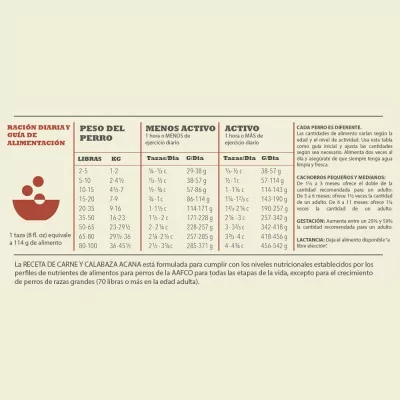 La RECETA DE CARNE Y CALABAZA ACANA está formulada para cumplir con los niveles nutricionales establecidos por los perfiles de nutrientes de alimentos para perros de la AAFCO para todas las etapas de la vida, excepto para el crecimiento de perros de razas grandes (70 libras o más en la edad adulta).