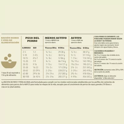 La RECETA DE PATO Y PERA ACANA está formulada para cumplir con los niveles nutricionales establecidos por los perfiles de nutrientes de alimentos para perros de la AAFCO para todas las etapas de la vida, excepto para el crecimiento de perros de razas grandes (70 libras o más en la edad adulta).