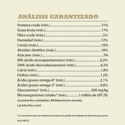 Análisis Garantizado: Proteína cruda (mín.) 31 %, Grasa bruta (mín.) 17 %, Fibra cruda (máx.) 5 %, Humedad (máx.) 12 %, Ceniza (máx.) 10%, Almidón dietético (máx.) 18 %, Azúcares (máx.) 5 %, EPA (ácido eicosapentaenoico) (mín.) 0,2 %, DHA (ácido docosahexaenoico) (mín.) 0,2 %, Calcio (mín.) 1,8 %, Fósforo (mín.) 1,2 %, Ácidos grasos omega-6* (mín.) 2,1 %, Ácidos grasos omega-3* (mín.) 0,8 %, Glucosamina* (mín.) 500 mg/kg, Microorganismos totales* (mín.) 1 millón de UFC/lb.