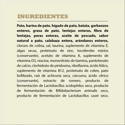 Ingredientes: Pato, harina de pato, hígado de pato, batata, garbanzos enteros, grasa de pato, lentejas enteras, fibra de lentejas, peras enteras, aceite de pescado, sabor natural a pato, calabaza entera, arándanos enteros, cloruro de colina, sal, taurina, suplemento de vitamina E, algas secas, proteinato de zinc, tocoferoles mixtos (conservante), acetato de vitamina A, suplemento de vitamina D3, niacina, mononitrato de tiamina, pantotenato de calcio, clorhidrato de piridoxina, riboflavina, ácido fólico, suplemento de vitamina B12, proteinato de cobre, pato liofilizado, raíz de achicoria seca, cúrcuma, ácido cítrico (conservante), extracto de romero, producto de fermentación de Lactobacillus acidophilus seco, producto de fermentación de Bifidobacterium animalis seco, producto de fermentación de Lactobacillus casei seco.