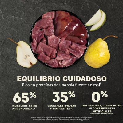 Complementada con peras enteras, batata y calabaza, fuentes naturales de fibra, esta receta ayuda a promover una digestión saludable y una microbiota intestinal equilibrada. Los ácidos grasos Omega-3 y Omega-6 del aceite de pescado natural favorecen una piel hidratada y un pelaje brillante, mientras que las frutas y verduras aportan antioxidantes que fortalecen el sistema inmunológico.