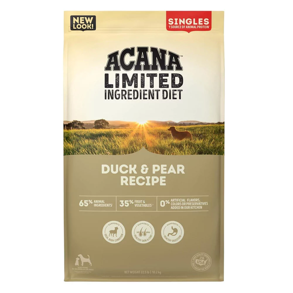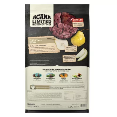 La Receta ACANA Singles Limited Ingredient Diet Pato y Pera está diseñada para perros con digestiones sensibles o paladares exigentes. Su fórmula contiene 65 % de ingredientes animales provenientes de pato crudo e hígado de pato, una proteína de alta calidad, deliciosa y de fácil digestión que contribuye al mantenimiento de la masa muscular y una óptima condición corporal.