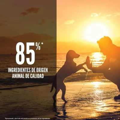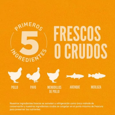Elaborado con un 85% de ingredientes de origen animal, incluyendo pollo, pavo, arenque entero y merluza entera.