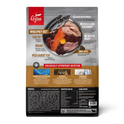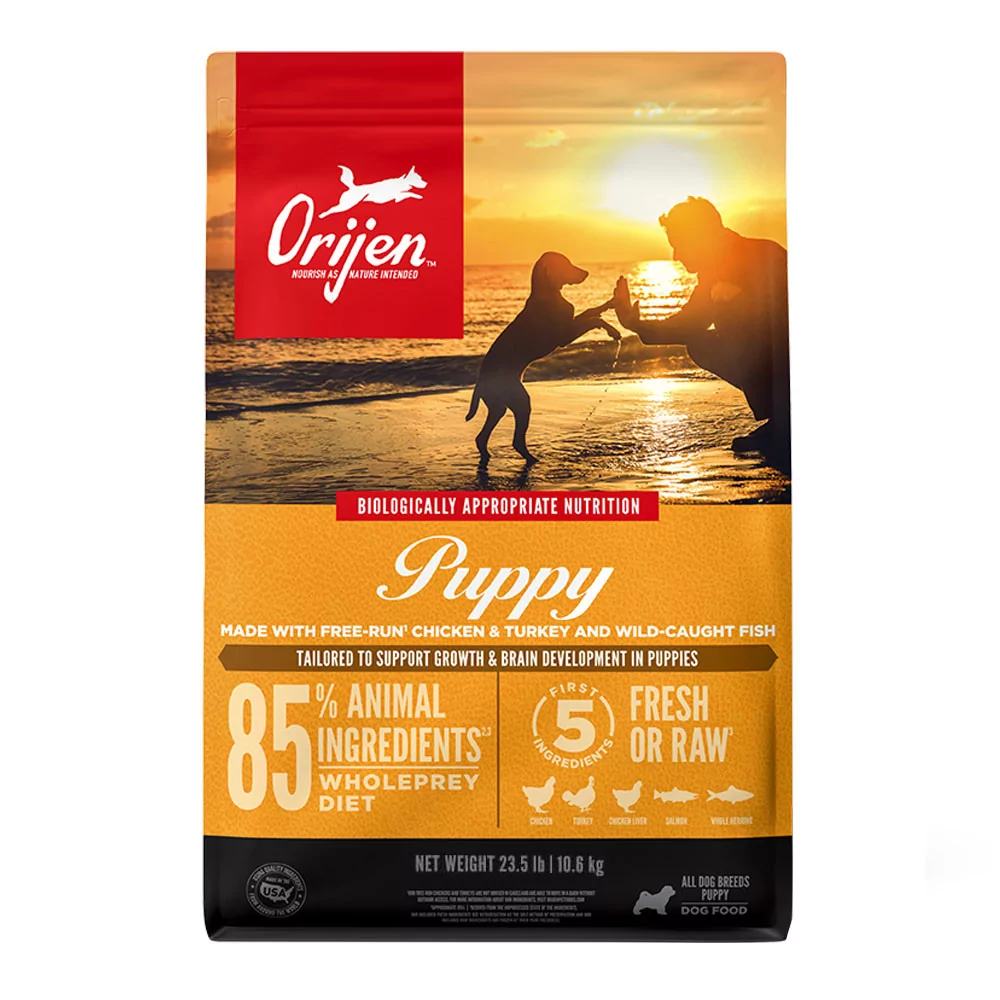 Ayuda a tu cachorro a crecer fuerte y sano con una receta rica en proteínas de origen animal que ofrece una nutrición superior. Los cachorros se desarrollan mejor con una alimentación Biologically Appropriate (Biológicamente Apropiada), basada en carnes de alta calidad y grasas naturales. ORIJEN Puppy contiene un 85% de ingredientes animales, incluyendo pollo y pavo frescos o crudos, además de pescado salvaje o de piscicultura sostenible que aporta nutrientes esenciales para un desarrollo óptimo.