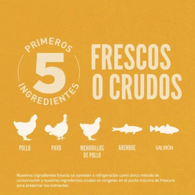 Elaborado con un 85% de ingredientes de origen animal, incluyendo pollo, pavo, arenque entero y salmón.