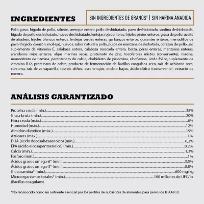 Análisis garantizado: Proteína cruda (mín.) 38%, Grasa bruta (mín.) 20%, Fibra cruda (máx.) 6%, Humedad (máx.) 12%, Almidón dietético (máx.) 15%, Azúcares (máx.) 1%, DHA (ácido docosahexaenoico) (mín.) 0,2%, EPA (ácido eicosapentaenoico) (mín.) 0,2%, Calcio (mín.) 1,3%, Fósforo (mín.) 1%, Ácidos grasos omega-6* (mín.) 3,5%, Ácidos grasos omega-3* (mín.) 0,8%, Glucosamina* (mín.) 600 mg/kg, Microorganismos totales* (mín.) 100 millones de UFC/lb (Bacillus coagulans).