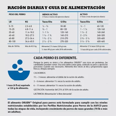 ORIJEN Original Dog está formulado para cumplir las recomendaciones nutricionales establecidas por FEDIAF para los alimentos de perros en todas las etapas de la vida, excepto para el crecimiento del cachorro de gran danés con menos de 14 semanas. Guardar en un lugar fresco y seco. No apto para consumo humano.