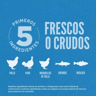 Primeros 5 ingredientes frescos o crudos: pollo, pavo, menudillos de pollo, arenque y merluza.