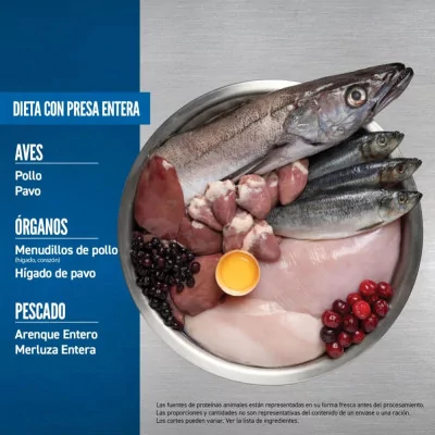 Elaborado con un 85% de ingredientes de origen animal, incluyendo pollo y pavo frescos o crudos, arenque y merluza.