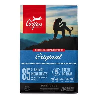 Orijen Original Dog Food es un alimento seco de calidad formulado con un 85% de ingredientes de origen animal, incorpora pollo y pavo frescos o crudos, arenque y merluza salvajes o de pesca sostenible, proporcionando proteínas de la más alta calidad y un perfil nutricional completo.