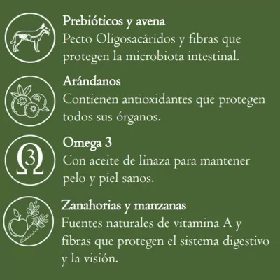 Ingredientes: Harina de carne, gluten de maiz, arroz, maíz, aceite vegetal, grasa de res, avena entera, salvado de trigo, sabor natural a hígado, levadura de cerveza, aceite de linaza (fuente de omega 3 y omega 6), harina de zanahorias, harina de arándanos, manzana deshidratada, antioxidantes (Tocoferoles), anti fúngicos (ácido ascórbico, ácido acético, ácido propiónico), cultivos prebióticos (Pecto Oligosacáridos POS), extracto de limón y manzana, Dl metionina, L- lisina, extracto de Yucca schidigera, vitaminas y minerales.