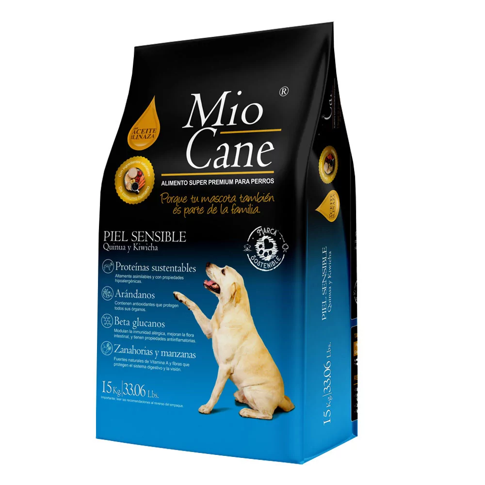 Mio Cane Super Premium – Piel Sensible Formulado para perros adultos con problemas de alergias o intolerancia a otros alimentos. No contiene proteína cárnica. Se utiliza avena, quinua, kiwicha y aislado de proteína. Estos ingredientes tienen elevado nivel de asimilación y eliminan los candidatos alérgenos. Recomendado también para perros con problemas gastrointestinales.