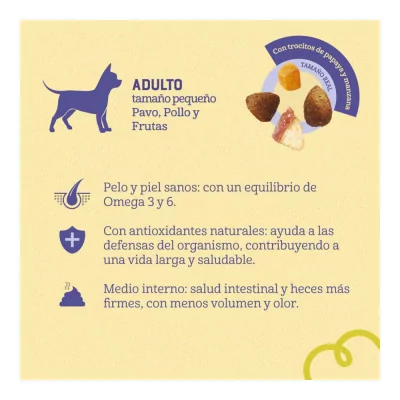 Alimento hecho con ingredientes naturales para perros adultos de razas pequeñas.