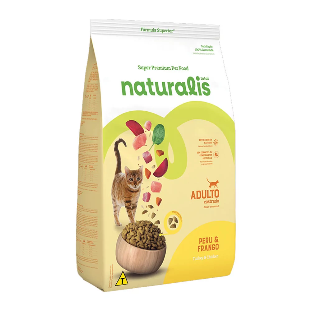 Naturalis Cats Pavo y Pollo Castrado es un alimento Super Premium elaborado con proteínas seleccionadas, cereales integrales, extracto de espinacas, y pulpa de zanahoria y remolacha. Estos ingredientes ofrecen un sabor único al paladar del gato y aportan más energía y vitalidad. Es 100% natural, sin colorantes ni conservantes artificiales. Contiene una mezcla deliciosa y balanceada de ingredientes que aseguran una nutrición completa para tu gato adulto, especialmente si está castrado.