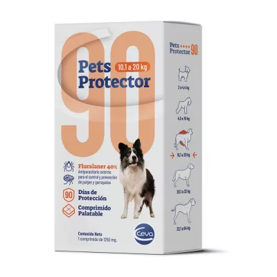 Pets Protector 90 es un comprimido antipulgas y antigarrapatas de acción prolongada, formulado para perros de entre 10,1 kg y 20 kg. Contiene Fluralaner (500 mg), un insecticida sistémico de última generación que actúa sobre el sistema nervioso de pulgas y garrapatas, provocando su eliminación rápida y efectiva.