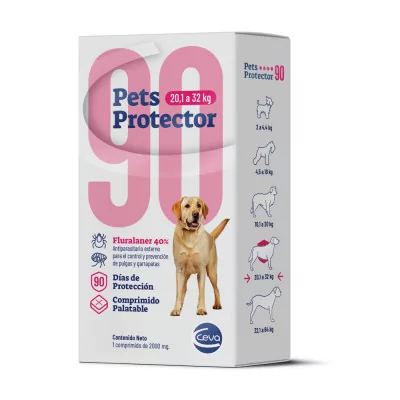 Pets Protector 90 es un comprimido antipulgas y antigarrapatas de acción prolongada, formulado para perros de entre 20,1 kg y 32 kg. Contiene Fluralaner (800 mg), un insecticida sistémico de última generación que actúa sobre el sistema nervioso de pulgas y garrapatas, provocando su eliminación rápida y efectiva.