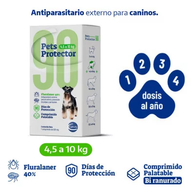 Pets Protector 90 es un comprimido antipulgas y antigarrapatas de acción prolongada, formulado para perros de entre 4.5kg a 10kg, que contiene Fluralaner, un insecticida sistémico de última generación que elimina pulgas y garrapatas de forma rápida y efectiva hasta por 12 semanas. Su formato palatable facilita la administración, ya que se puede dar como premio o junto con la comida, y puede utilizarse como apoyo en casos de dermatitis alérgica por picadura de pulga.