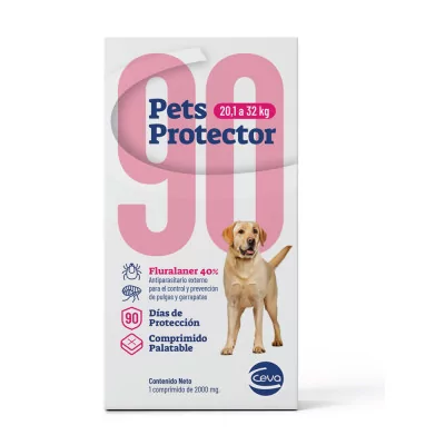 Pets Protector 90 es un comprimido antipulgas y antigarrapatas de acción prolongada, formulado para perros de entre 20.1kg a 32kg, que contiene Fluralaner, un insecticida sistémico de última generación que elimina pulgas y garrapatas de forma rápida y efectiva hasta por 12 semanas. Su formato palatable facilita la administración, ya que se puede dar como premio o junto con la comida, y puede utilizarse como apoyo en casos de dermatitis alérgica por picadura de pulga.
