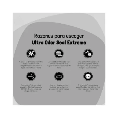America Litter Ultra Odor Seal Extreme con infusión de zeolita natural, no solo mejora el control y la absorción de olores, sino que también desintoxica el amoniaco y sella completamente el olor a orina, lo que hace que el baño de tu gato esté fresco y limpio.